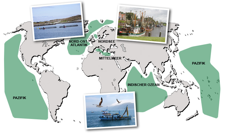 Nord- und Ostatlantik, Nordsee, Mittelmeer, Pazifik sowie Indischer Ozean.